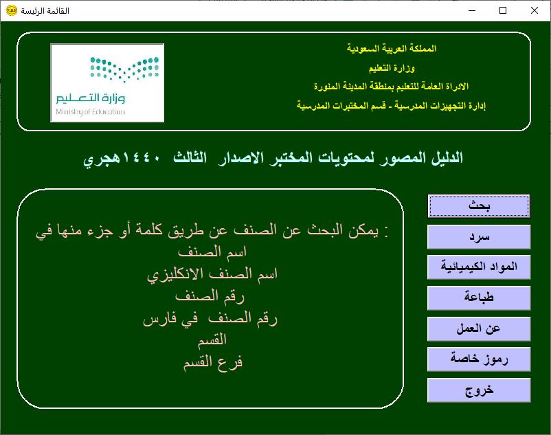 بين يديكم برنامج يعمل على نظام ويندوز باسم الدليل المصور لمحتويات المختبر المدرسي بنسخته الثالثة، يهدف البرنامج إلى توفير طريقة إلكترونية تساعد محضر المختبر ومعلمي العلوم – الكيمياء والفيزياء والأحياء – وكذلك إدارة المدرسة على التعرف على الأجهزة والأدوات في المختبر المدرسي بدلالة اسم الصنف باللغة العربية والإنجليزية مع توفير صورة له، كما يمكنكم البحث عن الأصناف بدلالة الاسم، القسم، رقم التصنيف أو بالصيغة الجزيئية للمواد الكيميائية.