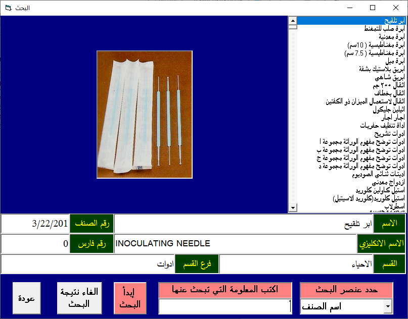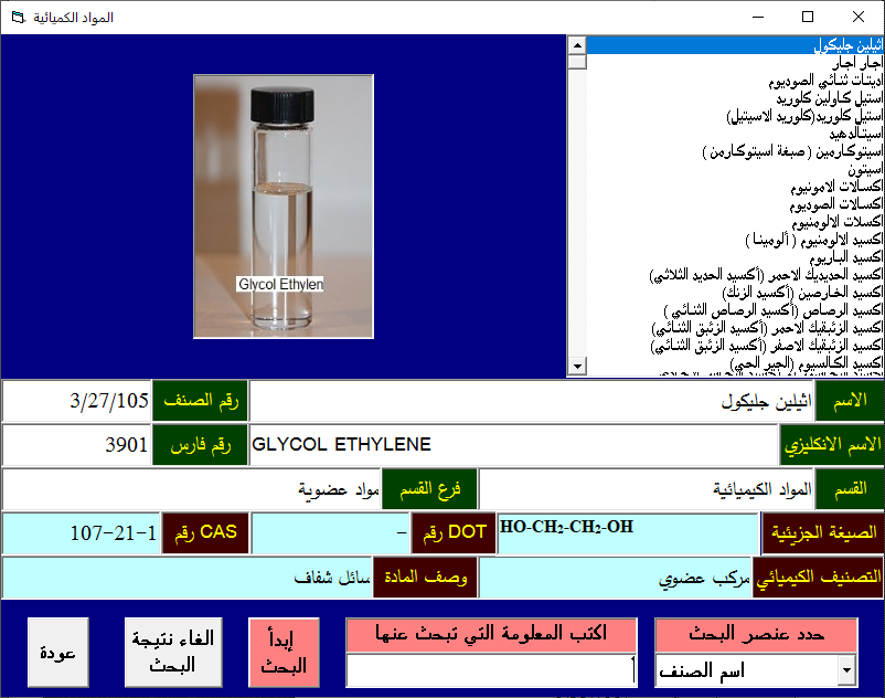 بين يديكم برنامج يعمل على نظام ويندوز باسم الدليل المصور لمحتويات المختبر المدرسي بنسخته الثالثة، يهدف البرنامج إلى توفير طريقة إلكترونية تساعد محضر المختبر ومعلمي العلوم – الكيمياء والفيزياء والأحياء – وكذلك إدارة المدرسة على التعرف على الأجهزة والأدوات في المختبر المدرسي بدلالة اسم الصنف باللغة العربية والإنجليزية مع توفير صورة له، كما يمكنكم البحث عن الأصناف بدلالة الاسم، القسم، رقم التصنيف أو بالصيغة الجزيئية للمواد الكيميائية.