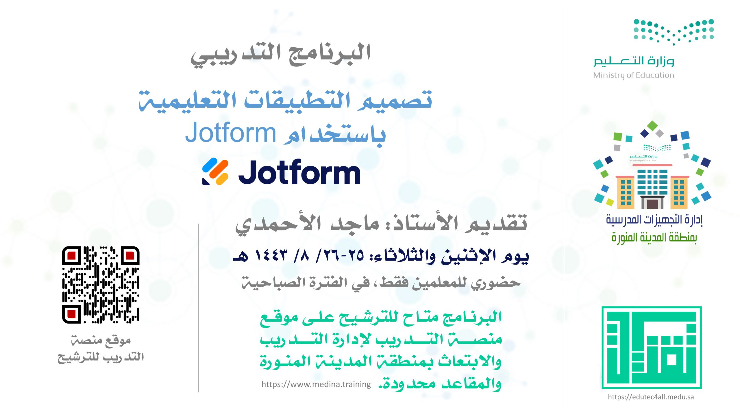 برنامج تصميم التطبيقات التعليمية باستخدام Jotform تقنيات التعليم 22 مارس، 2022 رابط الترشيح خاص بمعلمي منطقة المدينة المنورة منصة التدريب رابط موقع Jotform