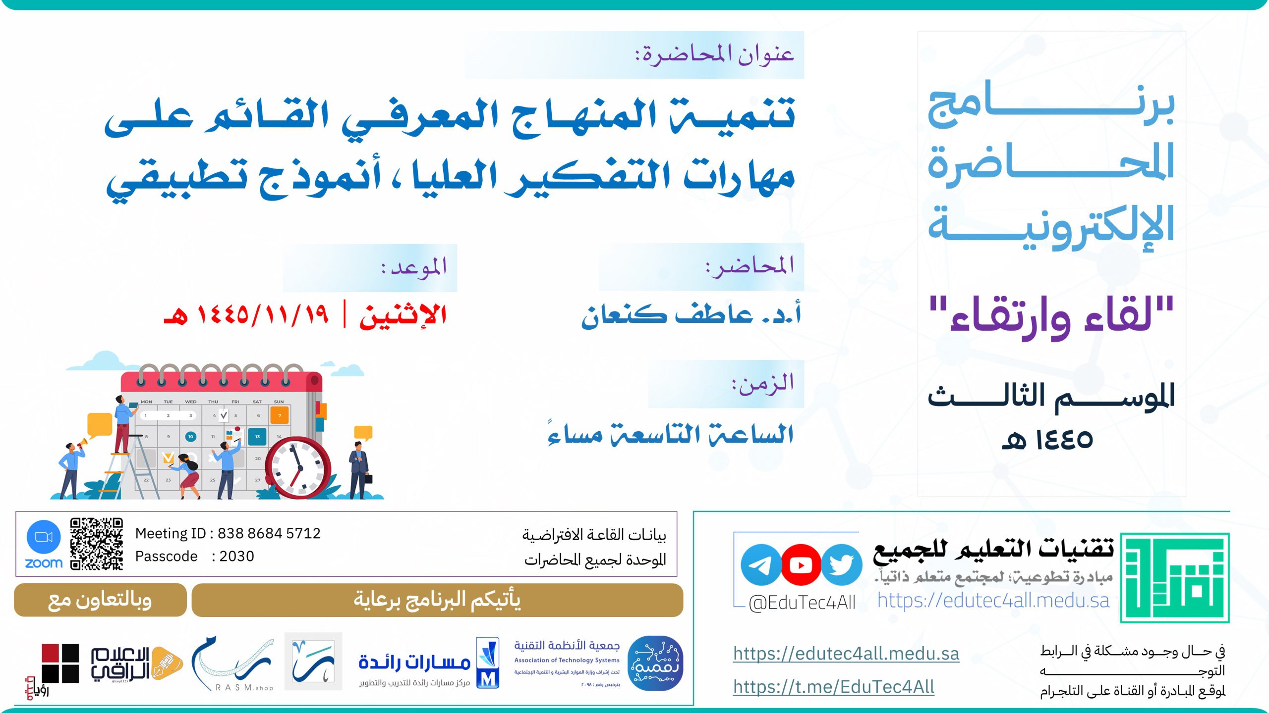 محاضرة: تنمية المنهاج المعرفي القائم على مهارات التفكير العليا أنموذج تطبيقي تقنيات التعليم 26 مايو، 2024 الدعوة عامة (رجال / نساء) رابط القاعة الافتراضية عبر منصة ZOOM : هنا لكي يصلك تنبيه عبر البريد الإلكتروني للمحاضرات القادمة اشترك بالقائمة البريدية للموقع كتابة بريدك الإلكتروني… اشتراك {{#message}}{{{message}}}{{/message}}{{^message}}Your submission failed. The server responded with {{status_text}} (code {{status_code}}). Please contact the developer of this form processor to improve this message. Learn More{{/message}}{{#message}}{{{message}}}{{/message}}{{^message}}It appears your submission was successful. Even though the server responded OK, it is possible the submission was not processed. Please contact the developer of this form processor to improve this message. Learn More{{/message}}Submitting…