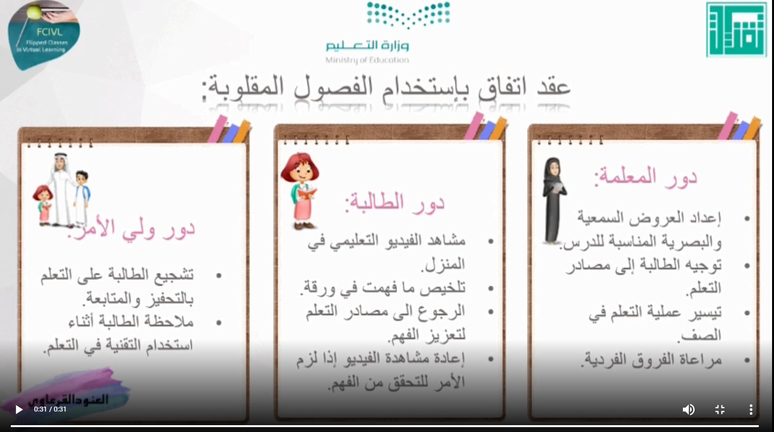 بنود ميثاق الاتفاقية قبل تطبيق استراتيجية الفصل المقلوب في الحصة الدراسية بين المعلم والطالب وولي الأمر من اجل تحقيق الجودة في الفصل المقلوب.