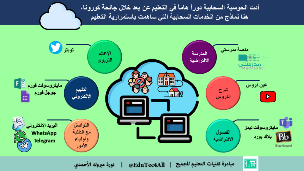 إن تأملنا تطبيقات الحوسبة السحابية في المجال التعليمي، نلاحظ أن نمط التعليم الحالي قائم بفضل الله على خدمات سحابية وُظفت لأداء عدد من الأغراض من شأنها المساهمة باستمرارية سير التعليم بيسر وسلاسة، من بين هذه الخدمات أدوات Microsoft Office 365 التي تضمنتها منصة مدرستي حيث تمثل تطبيقات وخدمات سحابية تخدم المعلمين والطلاب في أداء مهامهم التعليمية عن بعد.