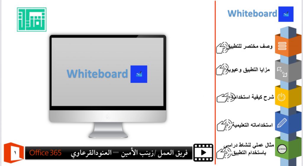 ماهي السبورة البيضاء ؟؟ لوحة رقمية من حزمة Office 365 هي مساحة حرة للكتابة والرسم والمشاركة مع الآخرين متاحة لأنظمة WindowsوiPhoone وiPad. موقع Microsoft Whiteboard روابط تحميل التطبيقWindows OS iPhone/iPad شرح برنامج مايكروسوفت وايت بورد Microsoft Whiteboard تعريف البرنامج (وصف مختصر ) المزايا والعيوب شرح كيفية استخدام البرنامج : الإستخدامات التعليمية ملف-فيديوهات-تفاعلي-سبورة-وايت-بورد
