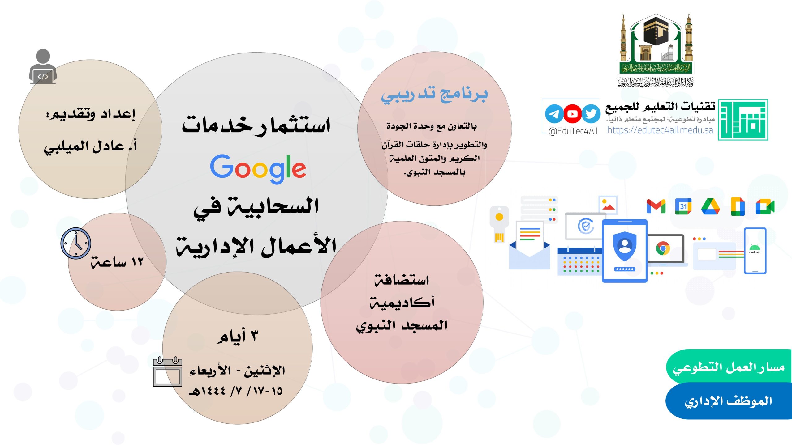 برنامج تدريبي أقيم بالتعاون مع وحدة الجودة والتطوير بإدارة حلقات القرآن الكريم والمتون العلمية بالمسجد النبوي وباستضافة أكاديمية المسجد النبوي لمدة 3 أيام وبواقع 12 ساعة تدريبية في الفترة المسائية؛ يهدف البرنامج إلى توجيه الاهتمام بأهمية الخدمات السحابية بشكل عام وخدمات Google بشكل خاص واكساب المتدربين مهارات أساسية في عدد من خدمات قوقل السحابية، تبادل المستفيدين خبراتهم الميدانية في هذا الجانب ومناقشة كيف كان لهذه الخدمات الأثر في تيسير مهامهم الإدارية مع أهمية أمن البيانات وحمايتها من خلال المحافظة على بيانات الدخول لحسابتهم الخاصة بالعمل.