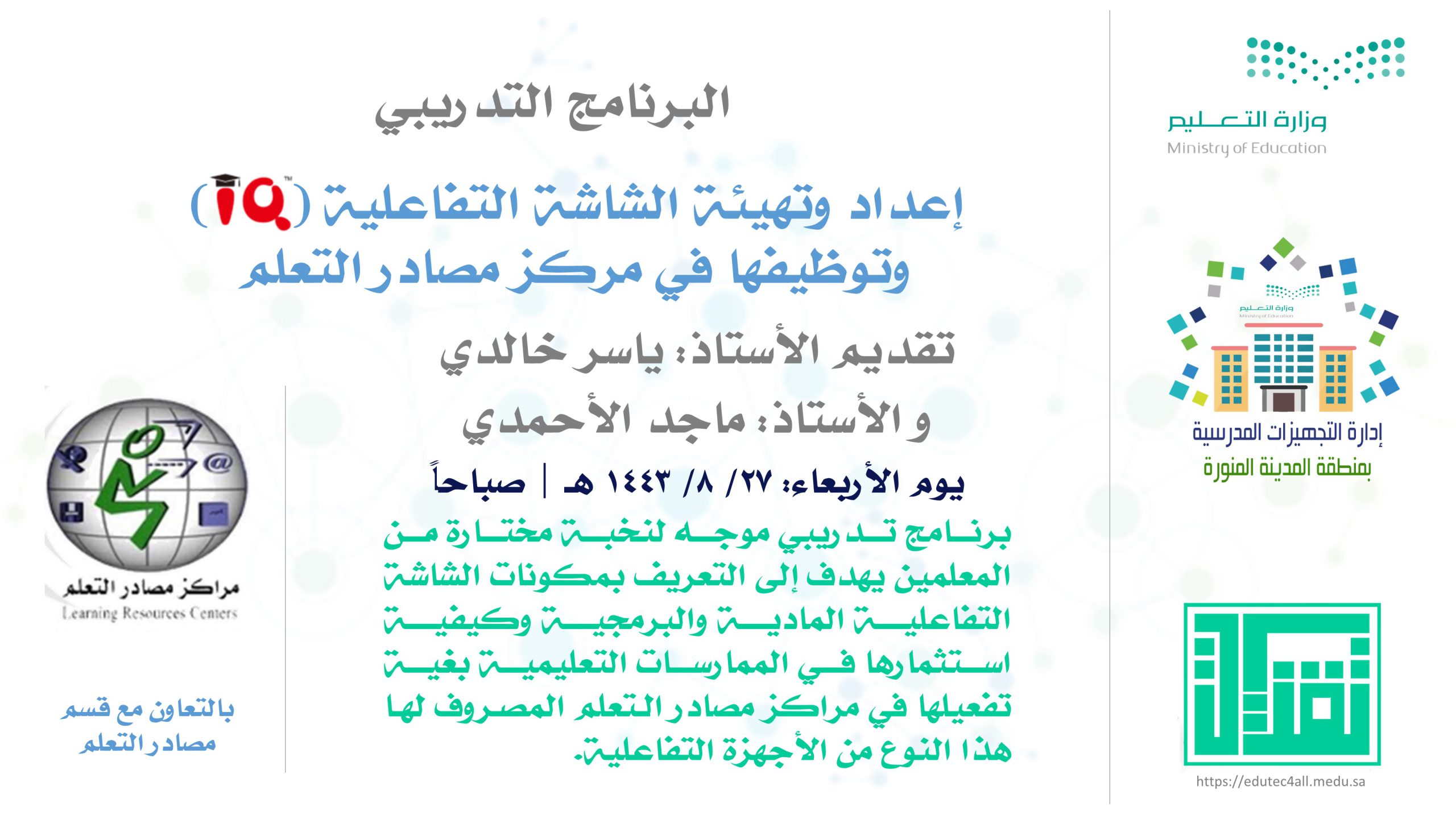 برنامج تدريبي تهيئة وإعداد الشاشة التفاعلية IQ وتوظيفها في مركز مصادر التعلم
