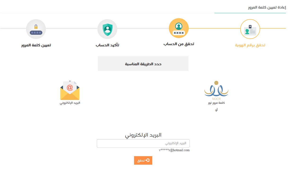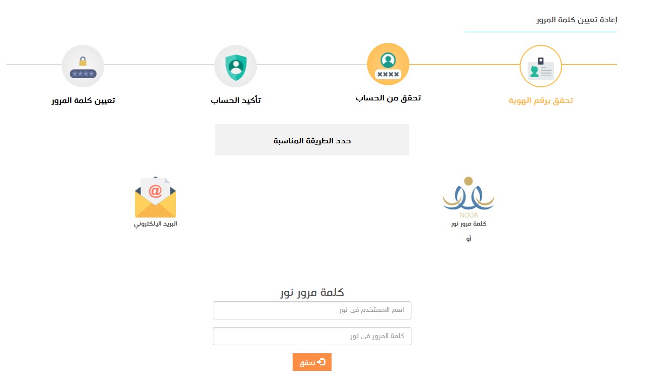 - بعدها سينتقل معك للخطوة الثانية تحقق من الحساب وهي على اسلوبين تختار بينهما إما من خلال حسابك بنظام نور حيث تسجل بيانات الدخول على نظام نور وهي الطريقة الأفضل أو من خلال البريد الإلكتروني، اختر أيهما تجده أفضل بالنسبة لك.