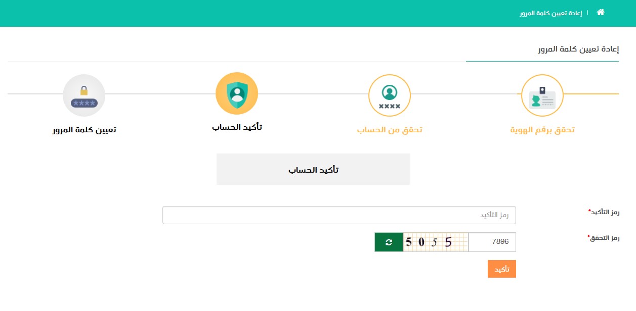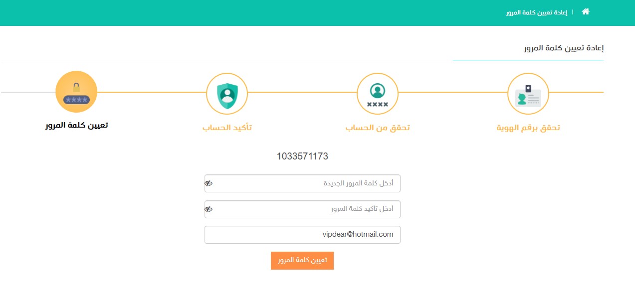 - وإن اخترت التحقق بواسطة “البريد الإلكتروني” سجل البريد الإلكتروني الذي سجلت به مسبقا سيوضح لك النظام جزءاً من البريد أكتب البريد كاملا ثم ينتقل معك إلى تأكيد الحساب حيث يرسل لك رمز التأكيد على بريدك راجع بريدك الإلكتروني واكتب الرمز المرسل ورمز التحقق بالصورة ثم اضغط على زر تأكيد، يتنقل بك النظام إلى شاشة تعيين كلمة المرور لتكتب كلمة المرور الجديدة مرتين ثم اضغط على تعيين كلمة المرور وبكذا تكون حدثت كلمة المرور جرب تسجيل الدخول من جديد بكلمة المرور الجديدة.