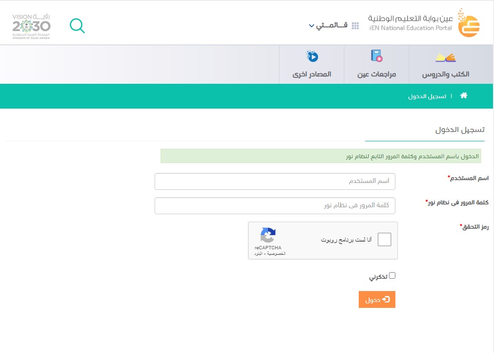 تم إجراء تحديث على نظام بوابة التعليم الوطنية عين خلال الفصل الدراسي الأول من العام الدراسي 1442/1441 هـ وأصبح الكل مسجل بصورة تلقائية في النظام ويمكن للمعلمين والطلاب وأولياء الأمور وقادة المدارس والمشرفين التربويين الدخول مباشرة لحسابهم بعين بنفس بيانات الدخول الخاصة بهم في نظام نور للإدارة التربوية.