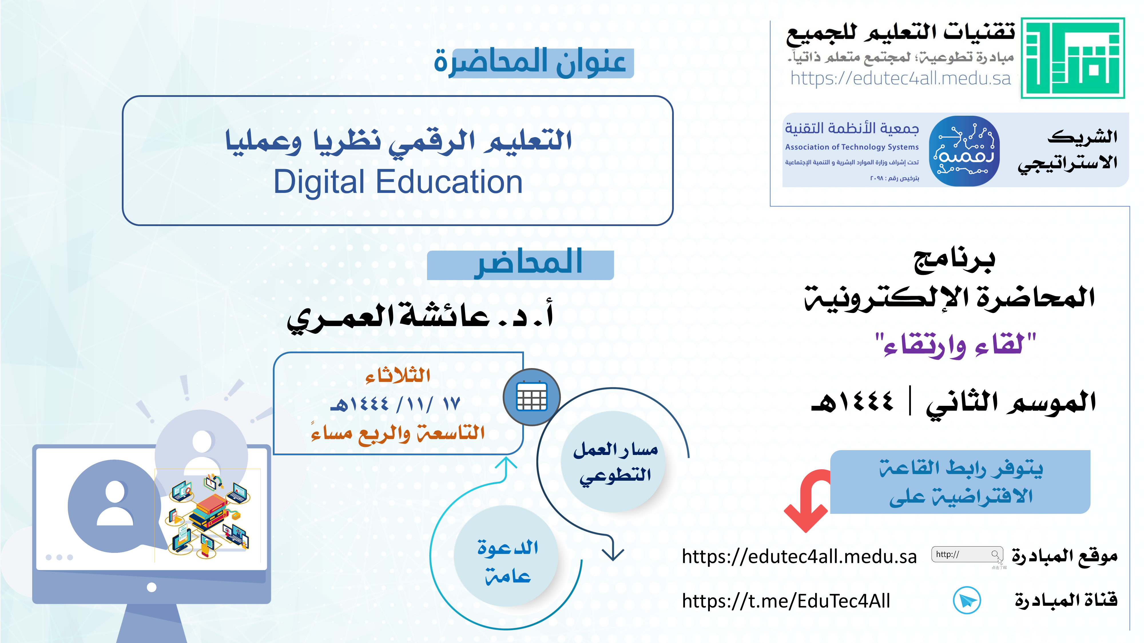 محاضرة: التعليم الرقمي نظريا وعمليا Digital Education تقنيات التعليم 4 يونيو، 2023 الدعوة عامة (رجال / نساء) رابط القاعة الافتراضية عبر منصة ZOOM : هنا لكي يصلك تنبيه عبر البريد الإلكتروني للمحاضرات القادمة اشترك بالقائمة البريدية للموقع كتابة بريدك الإلكتروني… اشتراك {{#message}}{{{message}}}{{/message}}{{^message}}Your submission failed. The server responded with {{status_text}} (code {{status_code}}). Please contact the developer of this form processor to improve this message. Learn More{{/message}}{{#message}}{{{message}}}{{/message}}{{^message}}It appears your submission was successful. Even though the server responded OK, it is possible the submission was not processed. Please contact the developer of this form processor to improve this message. Learn More{{/message}}Submitting… دعوة للحضور: برنامج المحاضرة الإلكترونية “لقاء وارتقاء” الموسم الثانيSee more